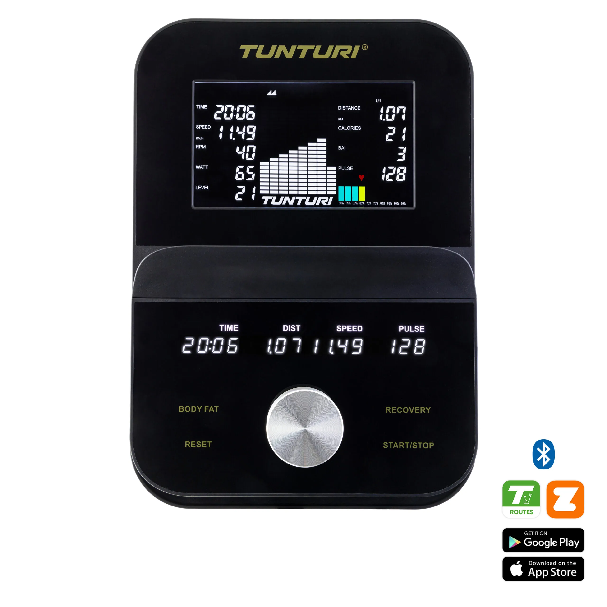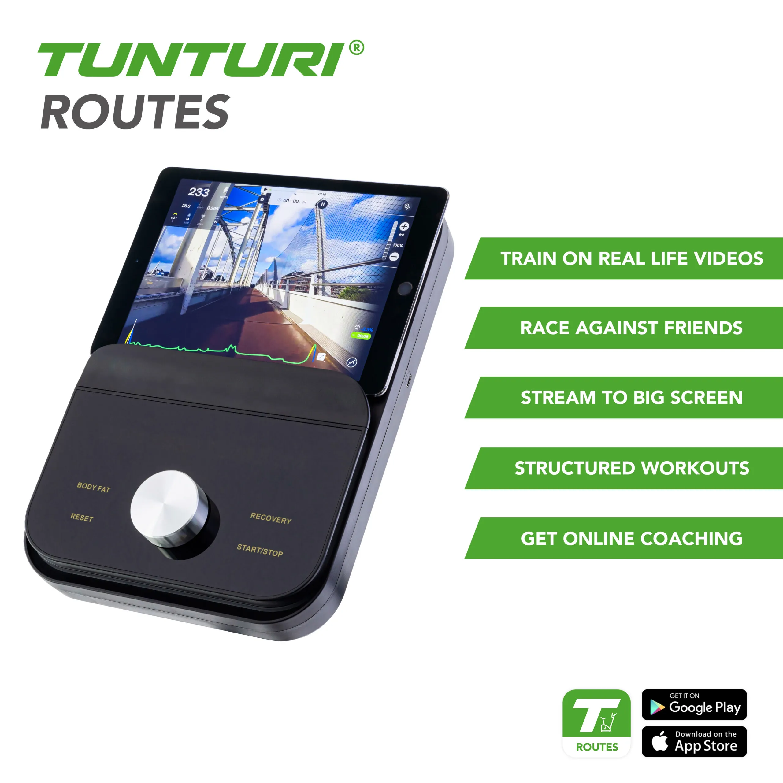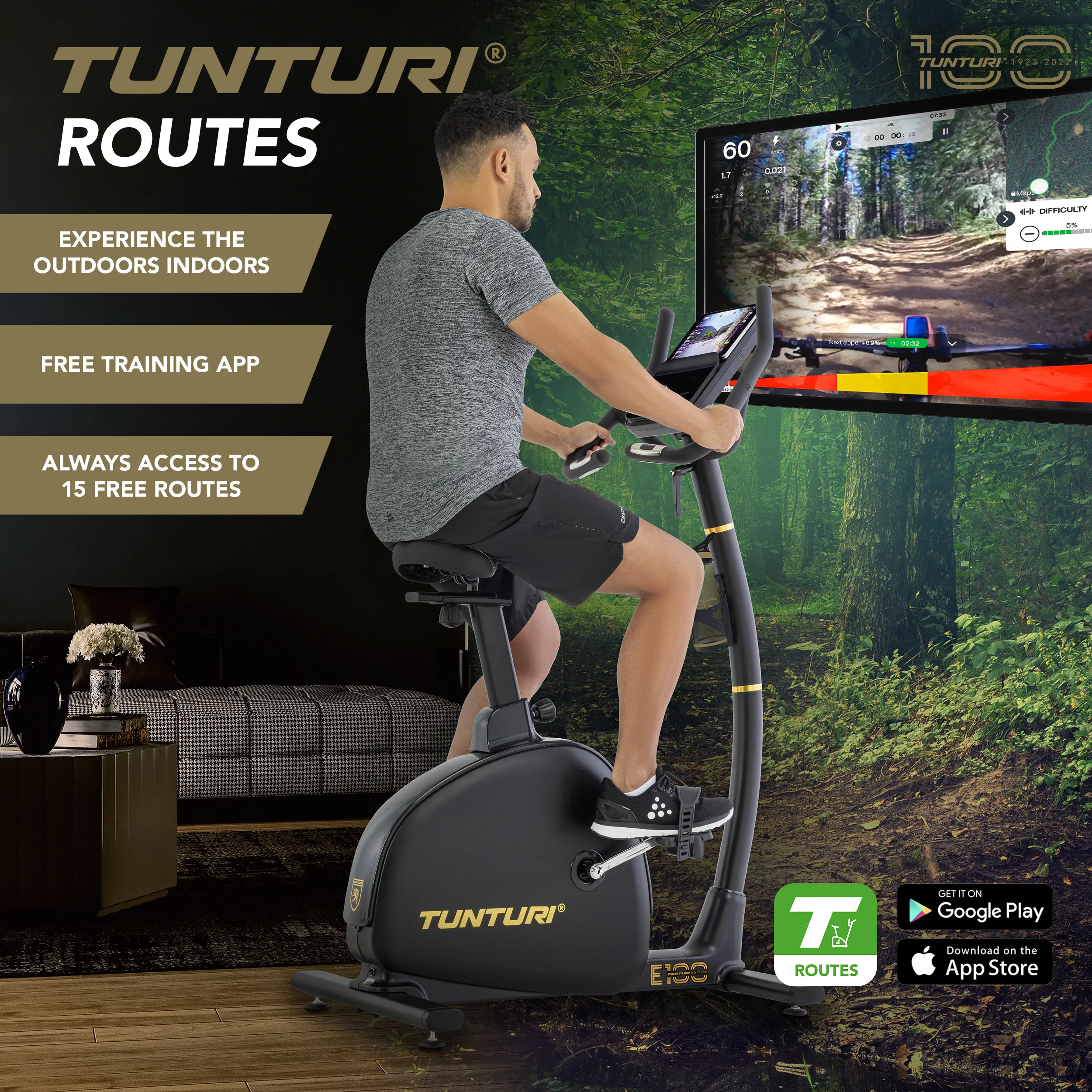 A Bluetooth kapcsolaton keresztül párosítható különböző vizuális alkalmazásokkal, például a Zwifttel és a Tunturi Routes-szal. A Tunturi Routes segítségével mindig hozzáférhetsz 15 ingyenes videós útvonalhoz, a fizetős verzió pedig hozzáférést biztosít például online edzésekhez, kihívásokhoz és versenyekhez. Ha az iConsole+ alkalmazást csatlakoztatod az E100-hoz, a mesterséges intelligencia személyre szabott edzésprogramot készít számodra az edzési eredményeid alapján. Így mindig a saját határaid között és személyes edzési célokkal edzhetsz.