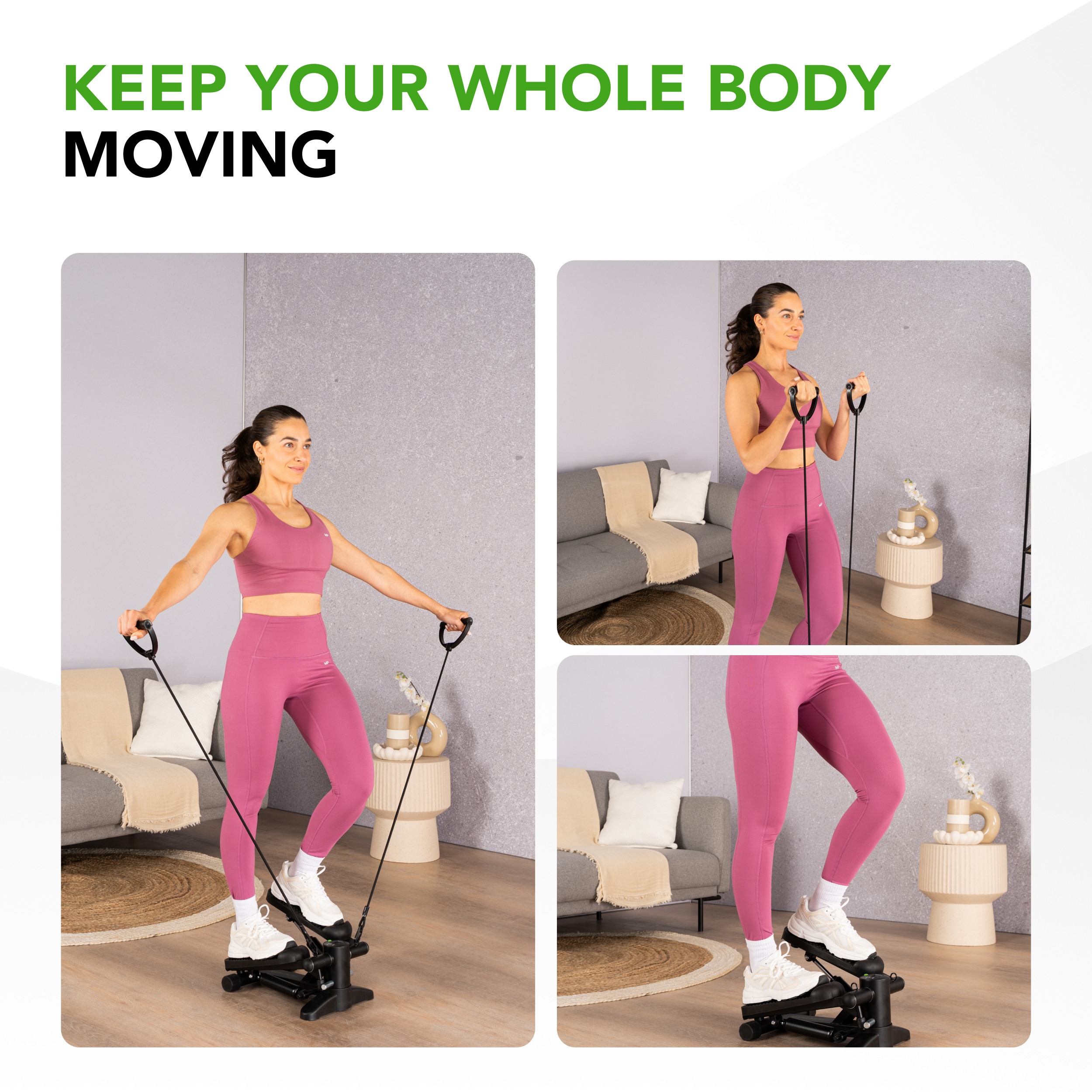 A Tunturi mini stepper egy kis helyigényű, kompakt, állítható lépésmagasságú lépcsőző gép az edzés adatairól információt nyújtó egykombos kijelzővel, kiegészítő gumiszalaggal a karok edzéséhez. Nagy előnye, hogy edzést követően könnyen tárolható.